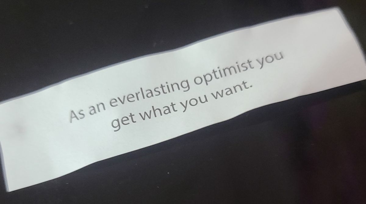 How should I deal with such information? I got it from a fortune cookie. Sounds like I’m not exactly pessimistic. After a long and very satisfying dinner at a Chinese restaurant, I take it as a hint not to think too much about difficult things and to try to be happy with all the things I will achieve in the future.