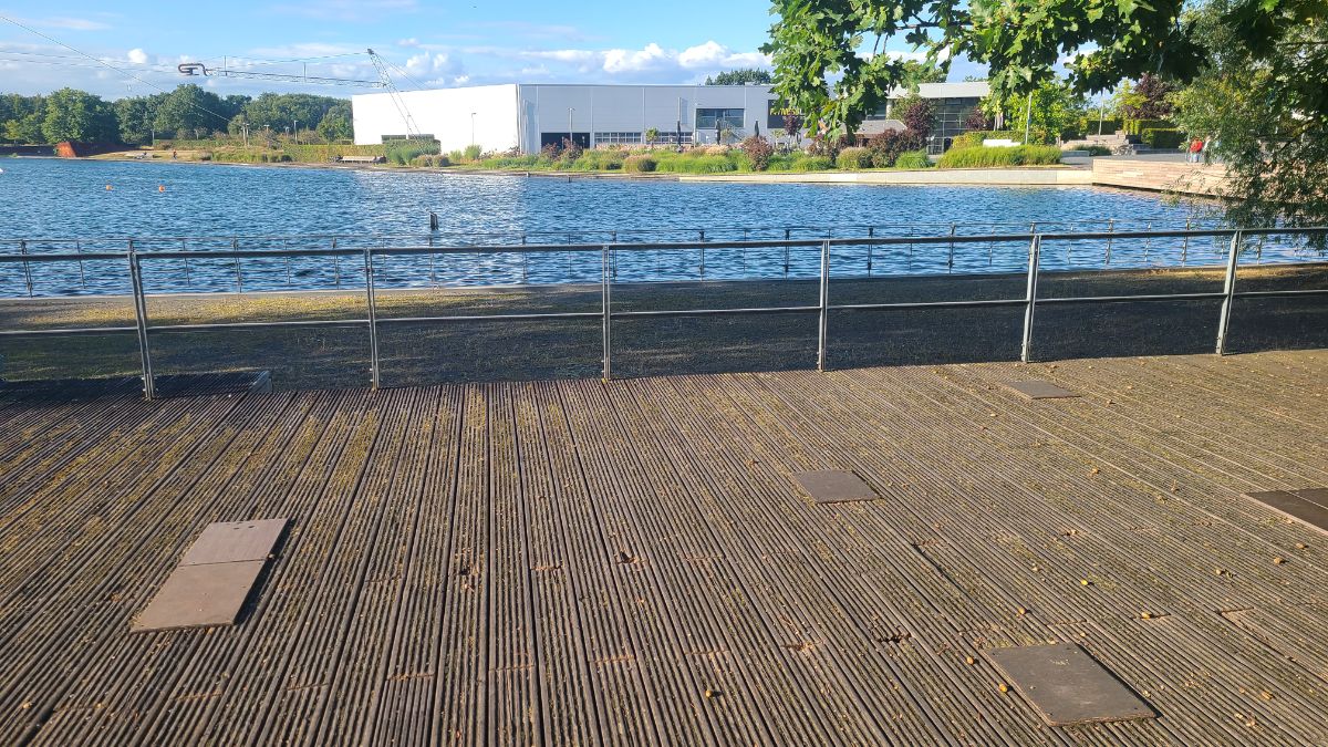On the way to Allersee, I passed the wakeboard facility and was somewhat surprised at how weathered and full of holes the wooden deck was. There were lots of repair spots, and I wouldn’t want to walk along here in the dark. But the facility was in operation. I’ll post some pictures here when people are riding the boards.